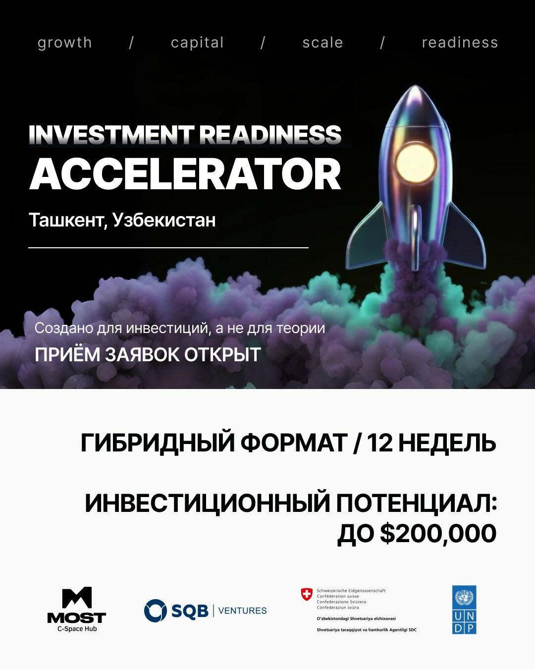 MOST C-Space Hub совместно с генеральным партнёром SQB Ventures и партнёрской организацией UNDP запускает акселерационную программу для стартапов, готовых к росту и привлечению инвестиций.