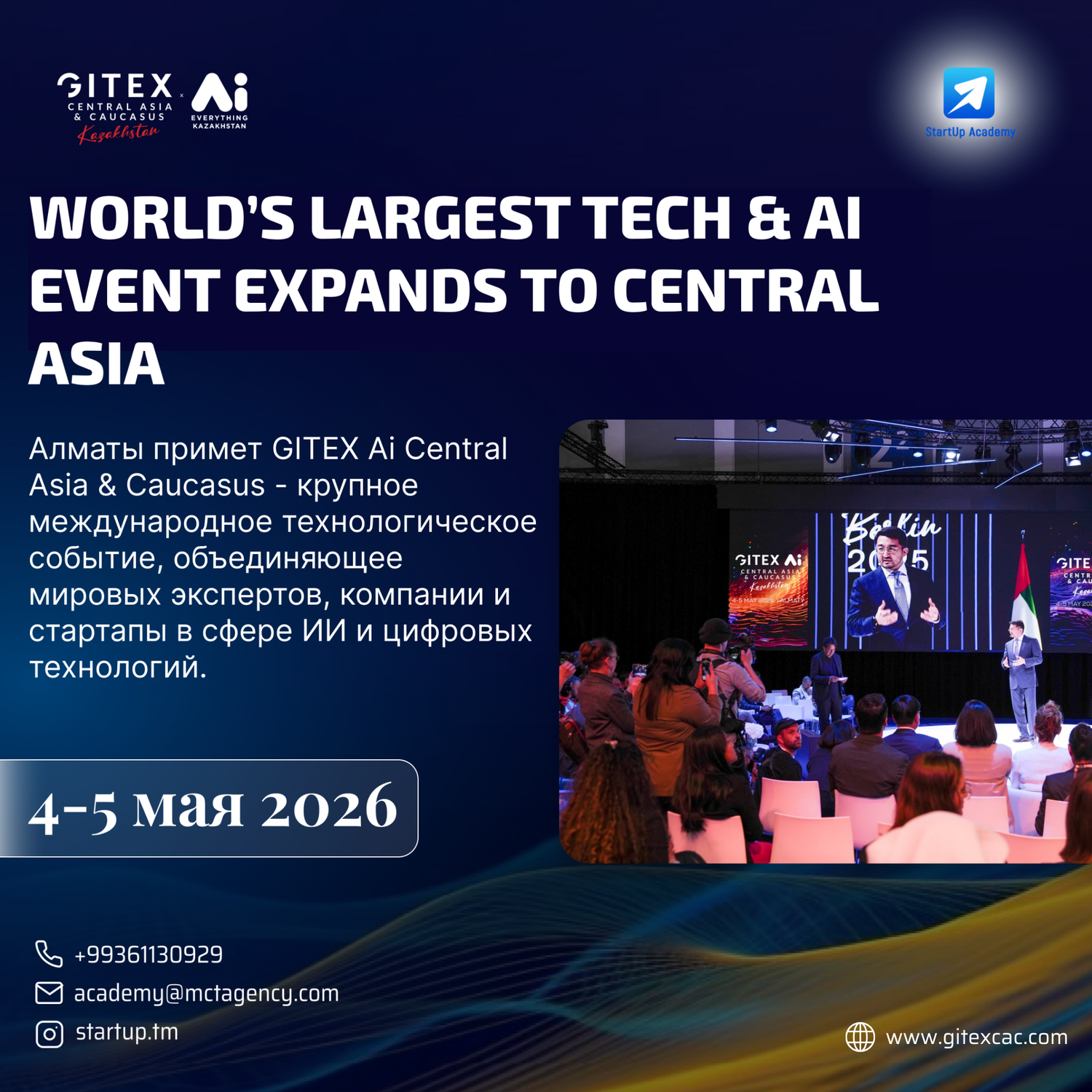 Мероприятие организовано inD - глобальным организатором мероприятий GITEX, и пройдет при поддержке Министерства искусственного интеллекта и цифрового развития Республики Казахстан, в партнерстве с Astana Hub и Акиматом города Алматы. GITEX Ai CENTRAL ASIA & CAUCASUS Kazakhstan соберет представителей государственных структур и технологических компаний, лидеров в сфере искусственного интеллекта, облачных и дата-инфраструктур, финтех-инноваторов и наиболее перспективные стартапы региона, с целью ускорить трансформацию Центральной Азии и Кавказа в конкурентоспособный цифровой центр.