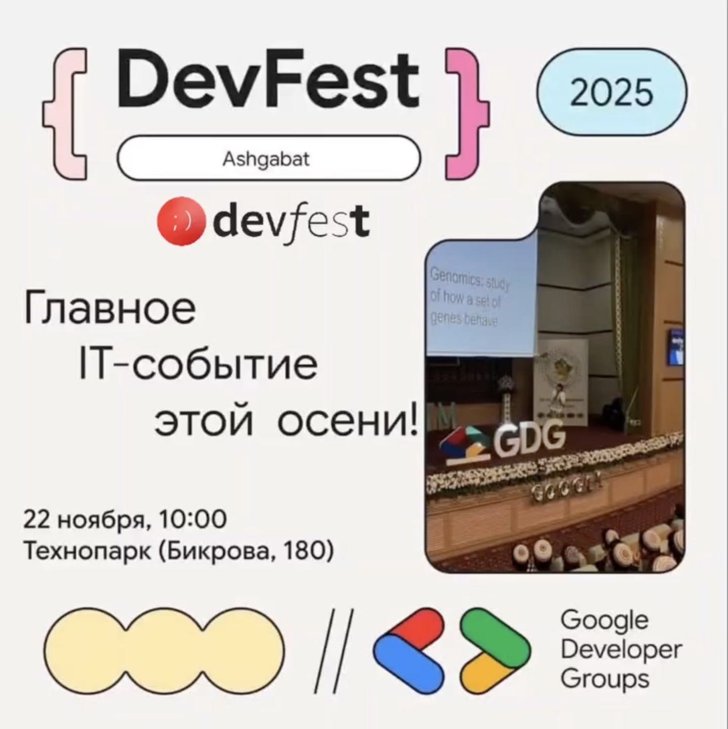 Команда Группы разработчиков Google в Ашхабаде (GDG Ashgabat) анонсирует проведение очередного Фестиваля разработчиков — DevFest 2024. Мероприятие состоится 1 декабря (воскресенье) в бизнес-центре «Аркач» (2-й этаж), в конференц-зале «Иш Нокады» и обещает стать ярким событием для всех, кто интересуется технологиями и программированием.