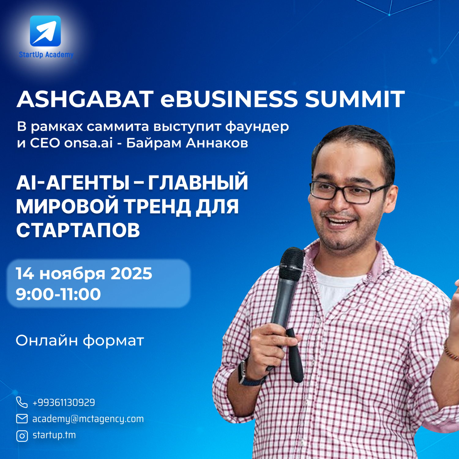 Не пропустите одно из самых ожидаемых событий года! 14 ноября 2025 года онлайн по Zoom, в рамках ASHGABAT eBUSINESS SUMMIT 2025 (организованного Startup Academy), состоится эксклюзивное выступление Байрама Аннакова, фаундера и CEO компании onsa.ai.