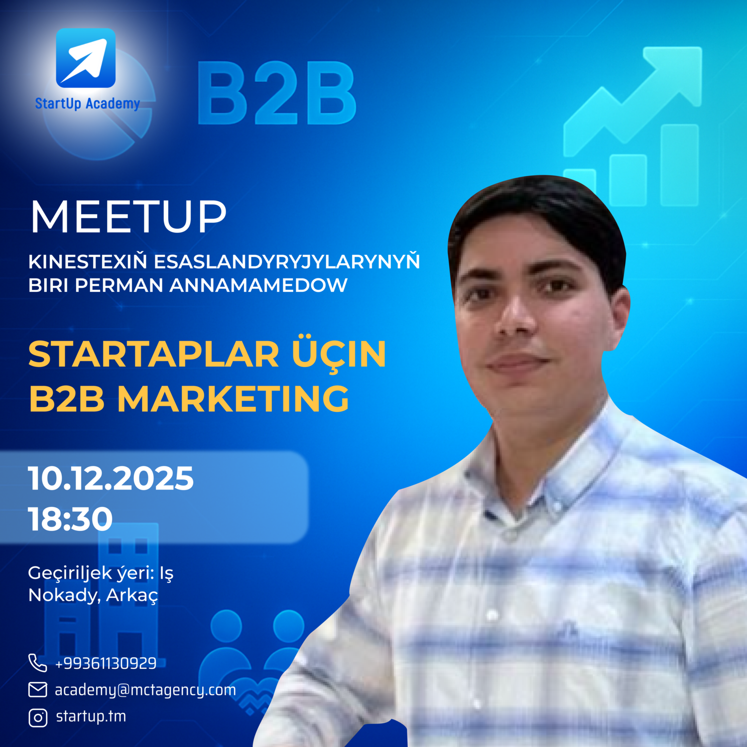 StartUp Academy startap jemgyýetçiliginiň ähli wekillerini «Startaplar üçin B2B marketing» atly amaly meetupa çagyrýar. Çärede Kinestex taslamasynyň esaslandyryjylarynyň biri Perman Annamamedow çykyş edip, korporatiw müşderileri çekmegiň strategiýalary, durnukly B2B-niň gurluşy hem-de ýaş toparlaryň kompaniýalar bazaryna çykyp, üstünlikli bäsleşip bilmegine ýardam berýän usullar barada giňişleýin gürrüň berer. Şeýle hem spiker özüniň önümini ösdürmekdäki tejribesini paýlaşar, täze başlan startaplaryň köplenç göýberýän ýalňyşlyklary, biznes üçin gymmatlyk teklibini nädip döretmeli we Merkezi Aziýada dogrudan işläp duran marketing kanallary barada bellär. Gatnaşyjylar startapyň başlangyç tapgyrynda B2B marketingini nädip meýilleşdirmeli, nädip gipotezalary synagdan geçirmeli we topar kiçi bolsada nädip satuwy guramaly bolýandygy barada düşünje alarlar.