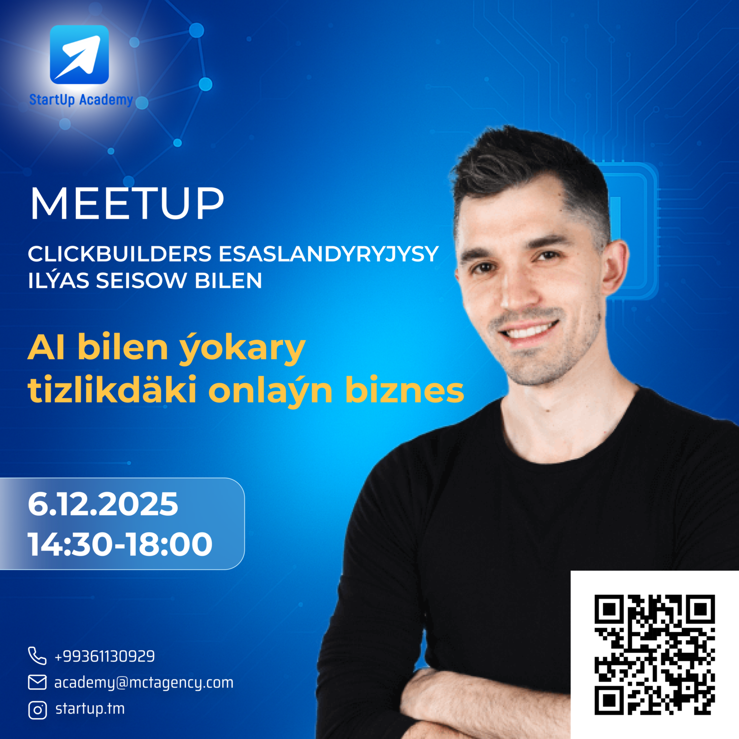 Meetup 2025-nji ýylyň 10-njy dekabrynda, sagat 18:30-da, Iş Nokady Arkaçda geçiriler. Bu - amaly gurallar almak, sorag bermek hem-de ýerli startap ekosistemasyndaky beýleki gatnaşyjylar bilen tanyşmak üçin ajaýyp mümkinçilikdir. Tehniki päsgelçilikler sebäpli registrasiýa diňe SMS arkaly kabul edilýär: +993 61 130929.