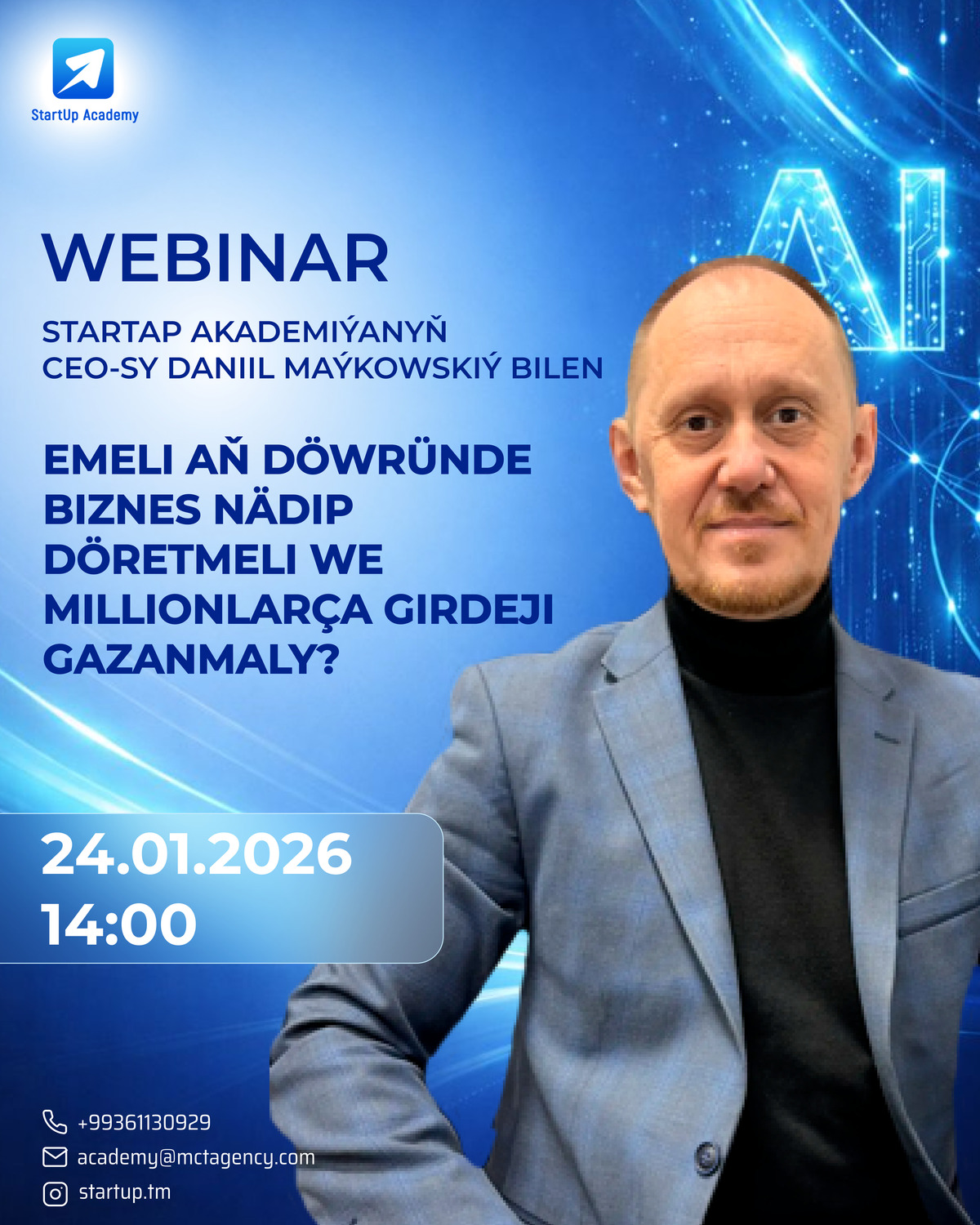 «Emeli aň döwründe nädip biznes gurmaly we millionlar gazanmaly?» atly onlaýn webinarda Daniil Maýkowskiý telekeçiler we startaplar üçin AI mümkinçiliklerinden peýdalanyp, girdejili biznes modellerini döretmegiň we global bazara çykmagyň amaly ýollaryny paýlaşar.