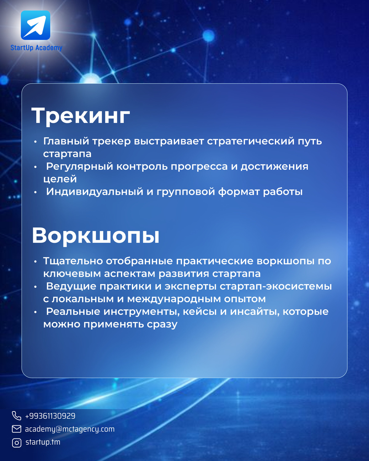 Ключевым элементом является трекинг - работа с главным трекером, который помогает сформировать стратегический путь стартапа и регулярно отслеживать прогресс. Это позволяет сохранять фокус и своевременно корректировать решения. Практические воркшопы дополняют процесс, давая стартапам реальные инструменты, кейсы и инсайты от экспертов с локальным и международным опытом.