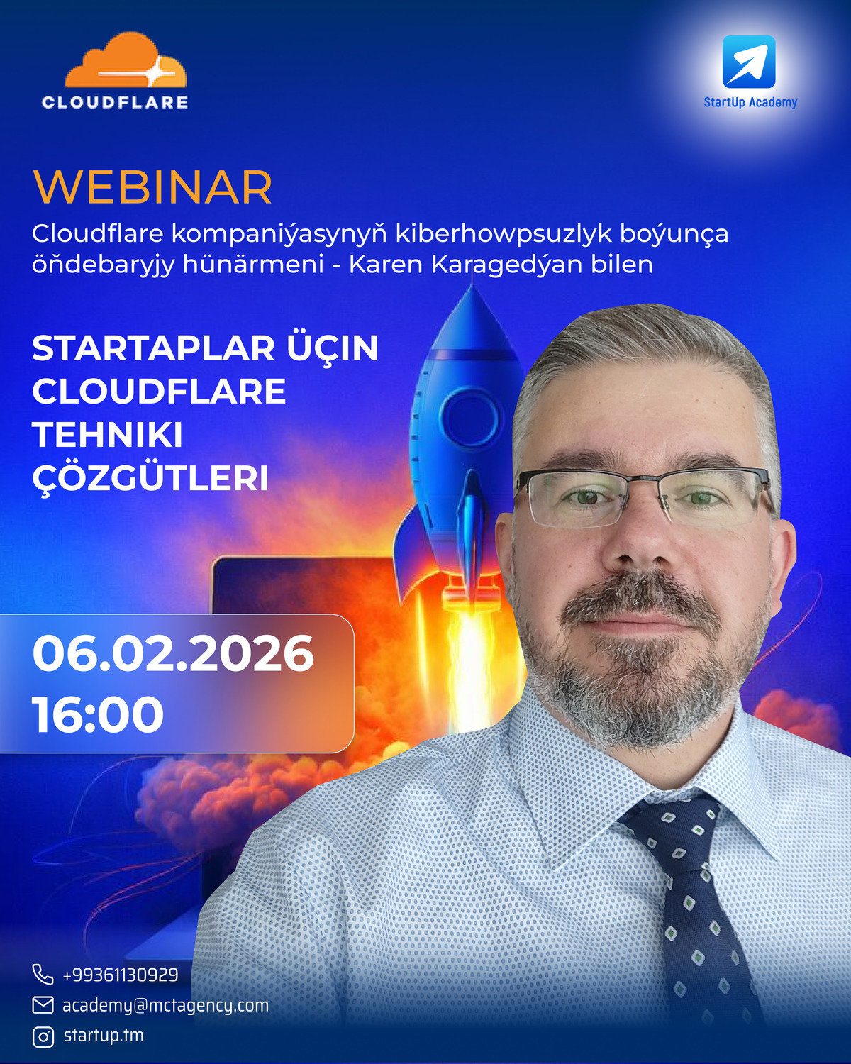 Webinaryň spikeri - Cloudflare kompaniýasynyň kiberhowpsuzlyk boýunça öňdebaryjy hünärmeni Karen Karagedýan bolup, ol startaplar we tehnologik taslamalar üçin Cloudflare çözgütlerini ulanmagyň amaly tejribesini paýlaşar.